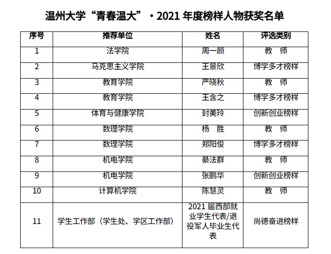 为积极培育和践行社会主义核心价值观,深入挖掘和宣传表彰我校青年先进典型,充分发挥先进典型的示范引领作用,近日,新葡萄8883官网AMG开展了2021年度“青春温大”榜样人物评选工作,并发文公布了评选结果,在全校11位榜样人物中,新葡萄官网杨胜老师和郑阳俊同学双双上榜,是新葡萄官网办学事业蒸蒸日上的见证,也是新葡萄官网优良教风学风的缩影,希望广大师生积极学习先进榜样,以实际行动为学院、学校事业发展做贡献!