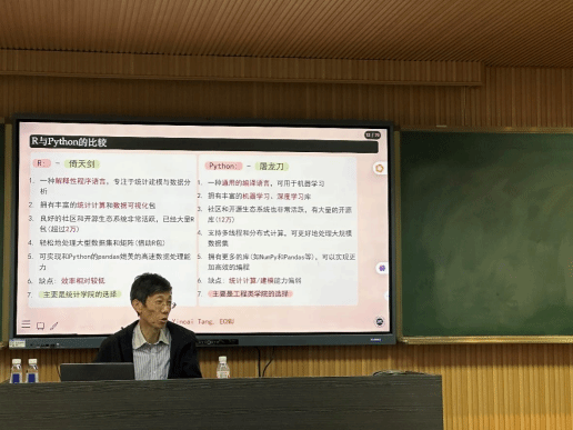 报告中,汤教授主要围绕文学化编程的思考、探索与实现和基于Quarto构建教学、科研、出版的新范式展开讨论。讲座分为三部分,首先汤教授以大数据时代学习与科研的效率为问,从一个从事教学和科研多年的老师的角度,分享了自己的一些想法与见解。其次,通过一些具体的案例说明自己在如何高效率、高质量地进行教学、科研和出版方面正在做的一些尝试与已经完成的成果,并开启了统计和数据科学人才培养体系与机制的探讨。