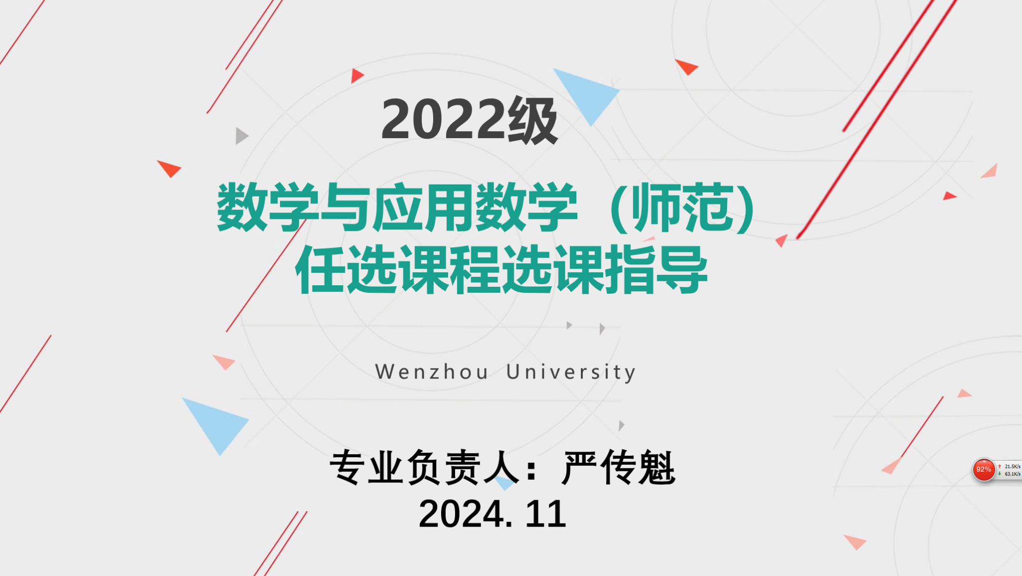 2024年11月2日晚上20:30,数学与应用数学(师范)专业负责人严传魁老师给2022级数学与应用数学(师范)专业所有同学开展了一次线上课程体系介绍与选课指导,为同学们分析课程体系,为任选课选择提供意见和建议。