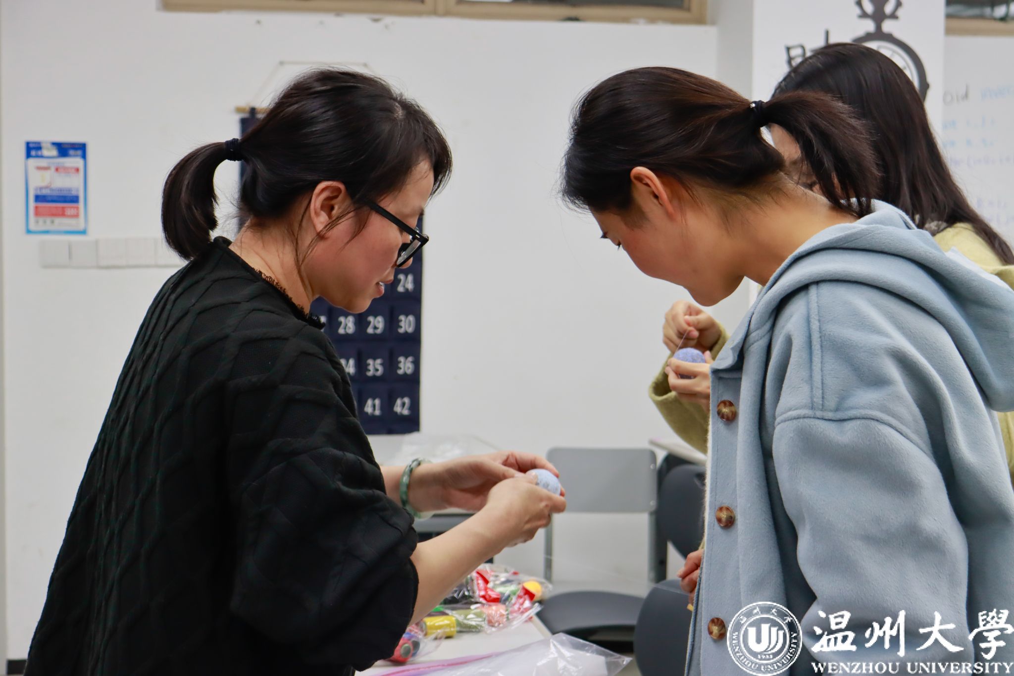 活动伊始,黄老师详细介绍了手鞠球的历史和文化意义,以及其制作的基本技巧。制作的第一步是将荞麦壳和薰衣草用不织布包裹起来,然后通过缝纫线缠绕成素球。素球制作完毕后,接下来便是分球的重要步骤。在这一环节中,师生们使用珠针和皮尺对素球进行精确的几何分割。黄老师强调,这一步需要非常精密的计算和细致的操作,因为它奠定了整个手鞠球花纹规则、工整的基础,对于最终作品的美观至关重要。完成分球后,参与者们开始在已经划分好的块面上绣制手鞠特有的花纹。在黄老师的指导下,大家小心翼翼地用绣线勾勒出精美的图案,直至最终完成了自己的作品。