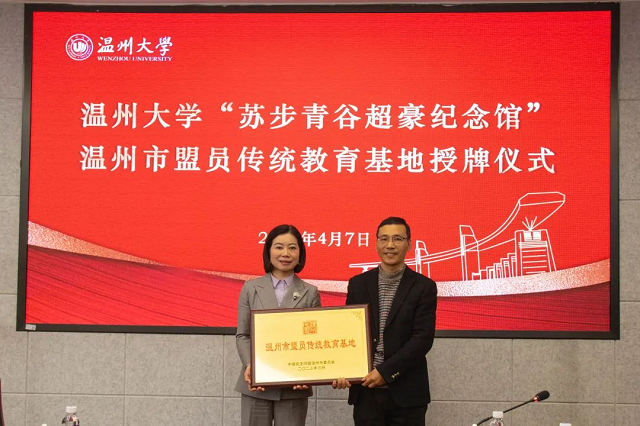 为大力弘扬科学家精神,加强民盟盟员思想建设,近日,民盟温州市委会与新葡萄8883官网AMG举行盟员传统教育基地授牌仪式,将新葡萄8883官网AMG苏步青谷超豪纪念馆定为温州市盟员传统教育基地。授牌仪式在新葡萄8883官网AMG岩松堂举行,民盟温州市委会专职副主委王黎然授牌,温大新葡萄8883官网AMG党委书记陈兴桂代表苏步青谷超豪纪念馆接牌。